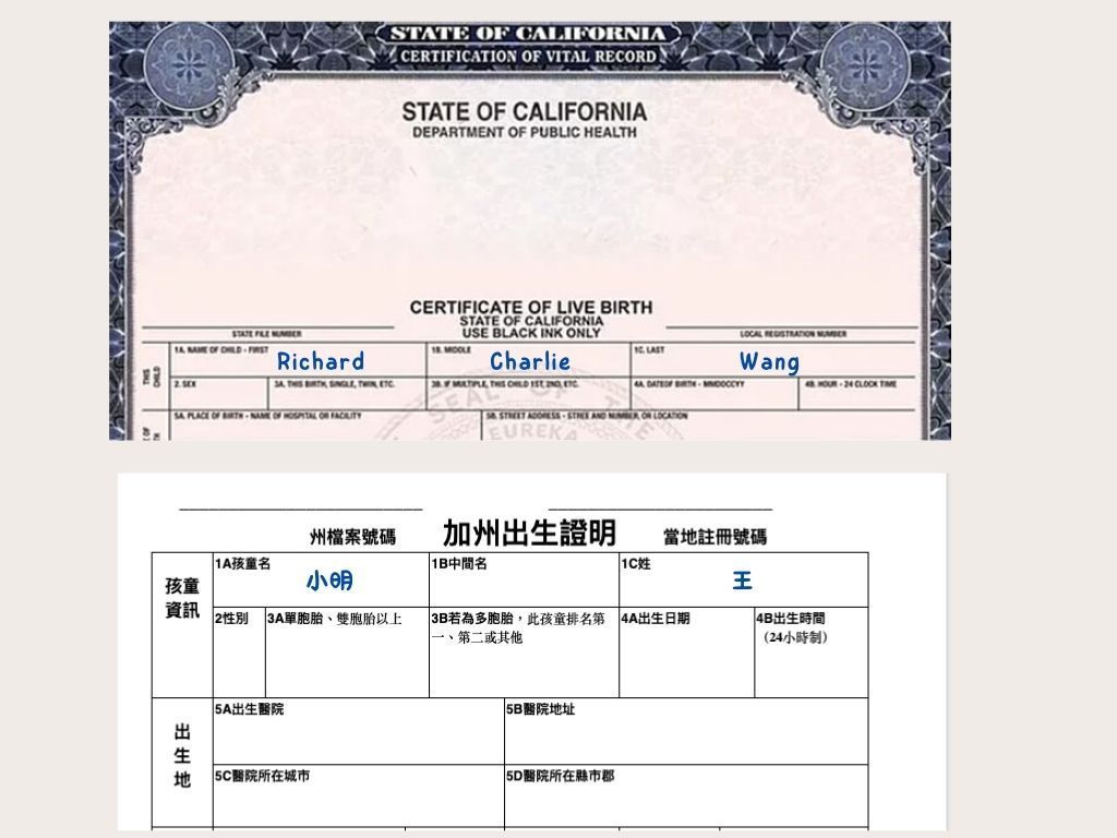 不需要!中譯本直接填上你想要給孩子的中文名字就好了。以加州出生證明為例,假設孩子的名字為 Richard Charlie Wang,你想要中文名字取王小明,就直接在中譯本填上王小明就可以了。填寫方式圖例: