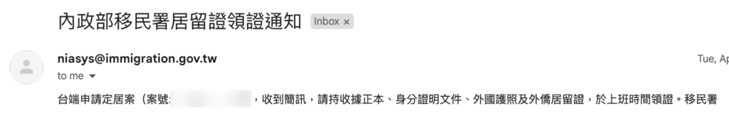 我們一週後就收到移民署的 email 說可以領了,email 長這樣: