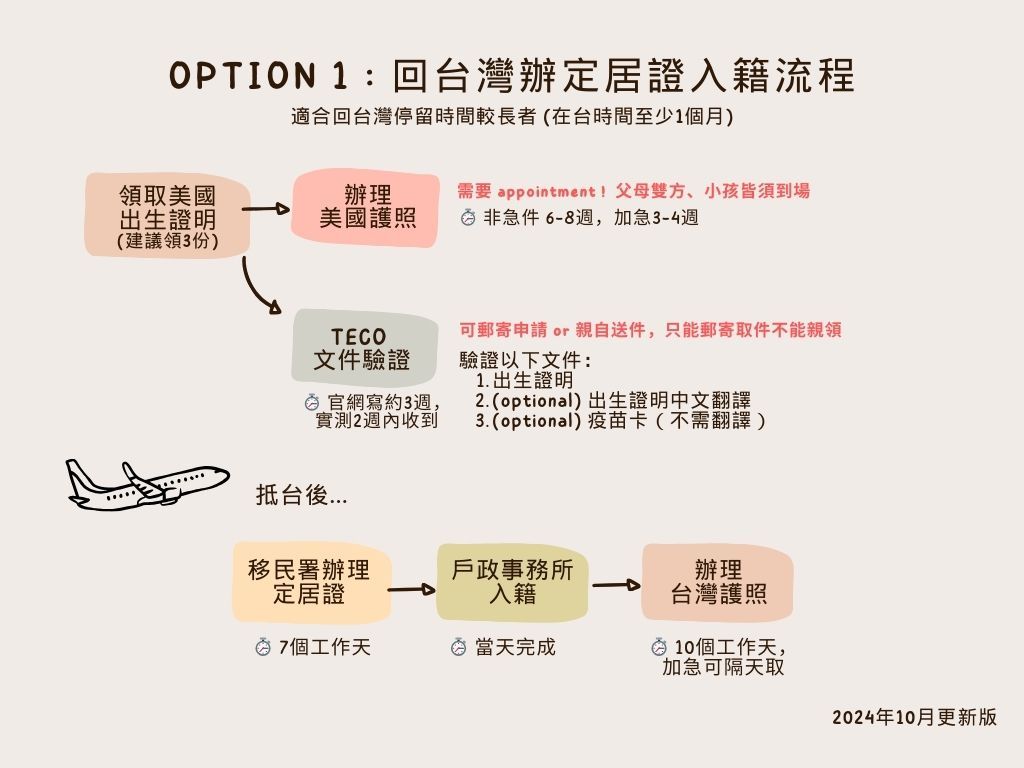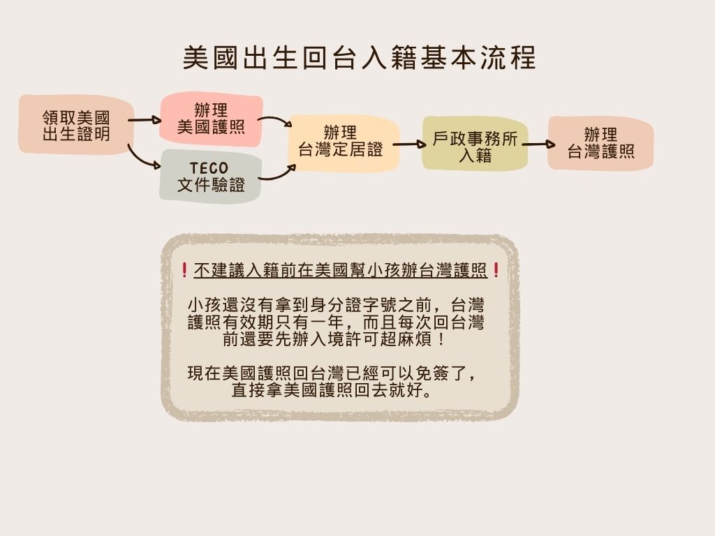 如果回台灣時間充裕,在美國最基本要做的就是把小孩的英文出生證明送去 TECO 驗證、辦理美國護照,就可以回台灣辦理入籍手續了。